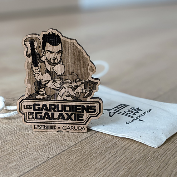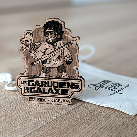 Conception graphique, gravure et découpe de badges/aimants pour l'entreprise "Garuda".